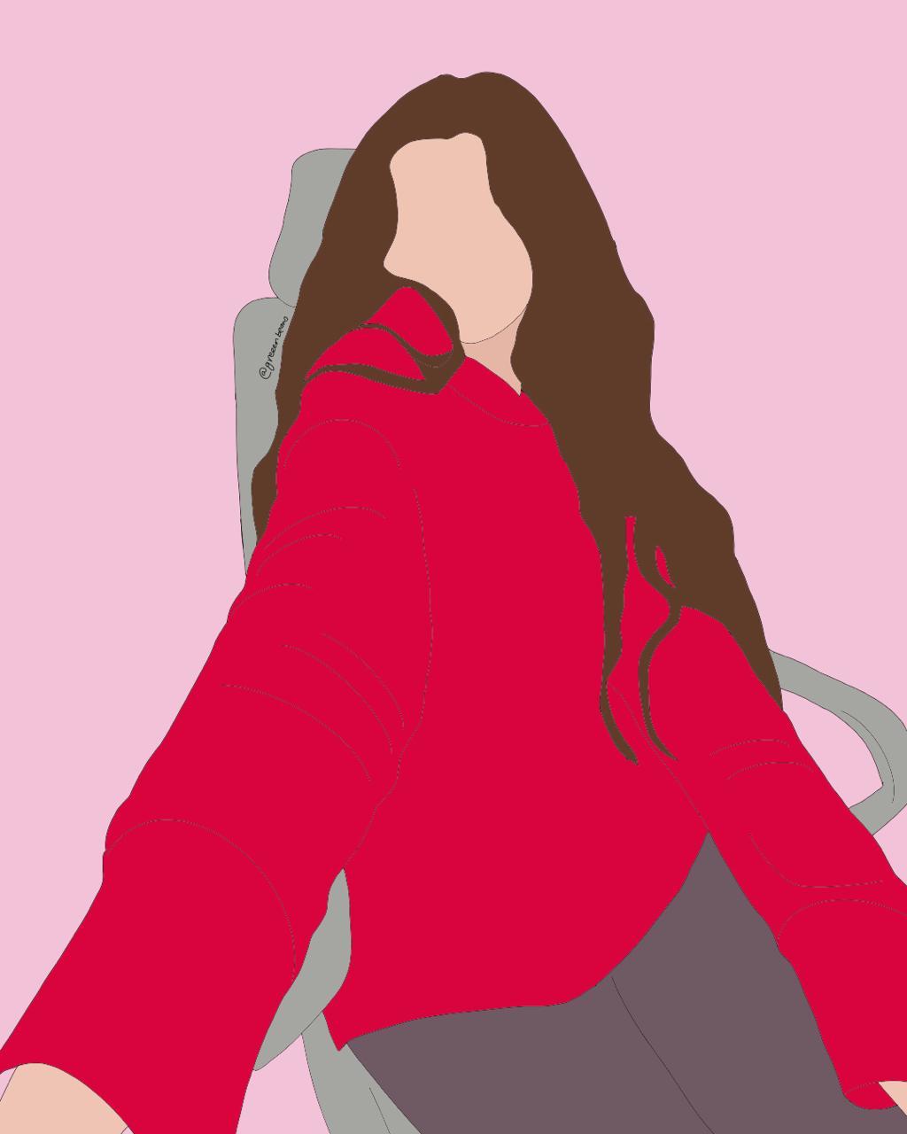 This digital illustration depicts a stylized woman with long brown hair, wearing a red hoodie and gray pants, sitting casually on a gray chair against a pink background. Her face is blank; lines suggest relaxed posture. A watermark is vertically near her shoulder.